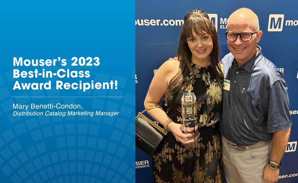 Bel Distribution Catalog Marketing Manager Mary Benetti-Condon received Mouser Electronics' prestigious 2023 Best-In-Class Award. Jeff Newell, Mouser's Senior Vice President of Products, presented the award to recognize Mary's exceptional contributions to Mouser's global distribution, marketing efforts, and new product information dissemination. Mary's consistent top performance year after year has resulted in her receiving an award for the fourth year in a row.